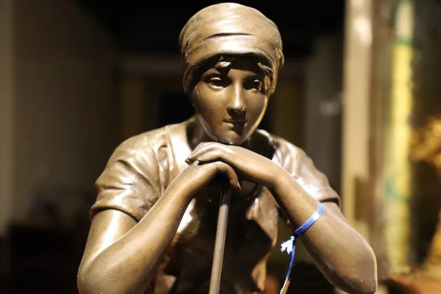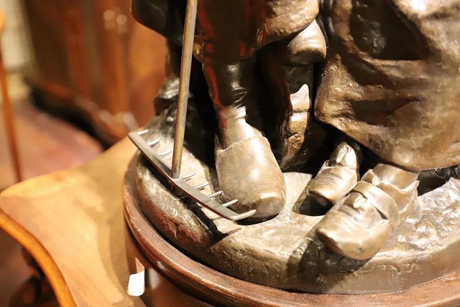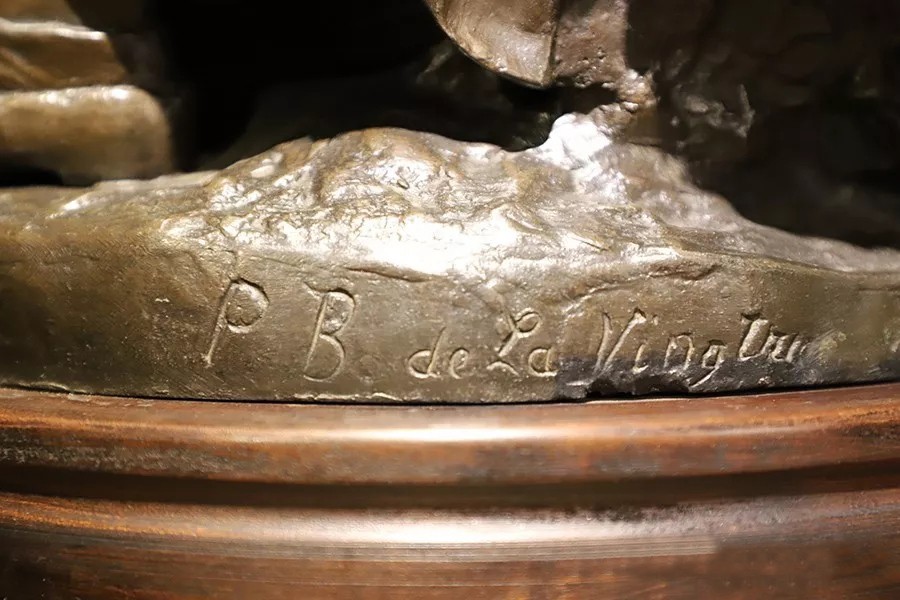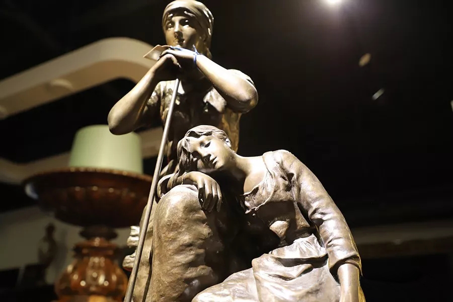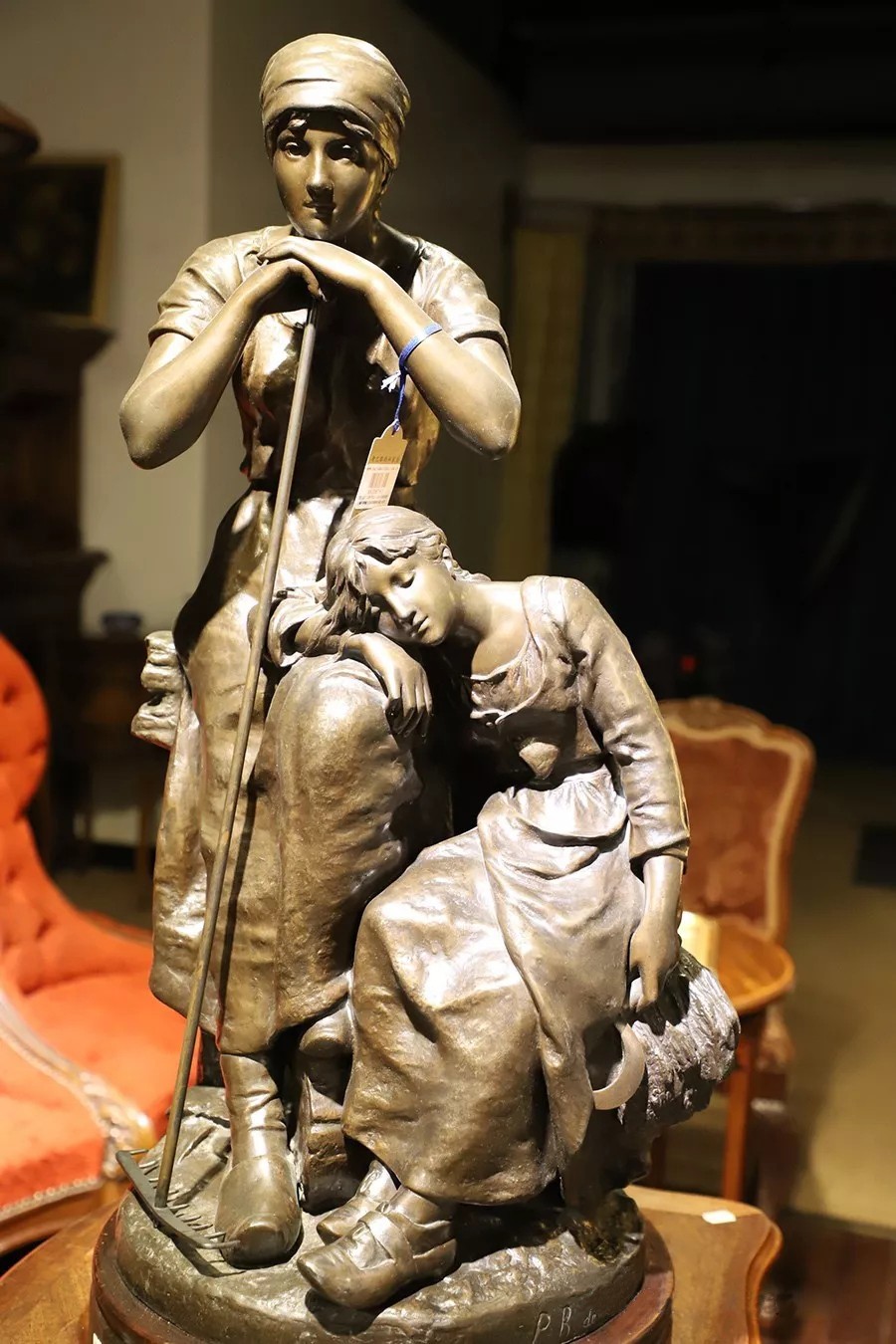 帶有作者簽名的鑄銅雕塑——《勞作歇息的少女》,描述了兩個正在休息的勞動少女形象,其中一個下巴擱在撐著耙子的雙手上,一個手持鐮刀側躺在撐著耙子的少女腿上睡著了,人物形象栩栩如生。尺寸為:高860×寬460×厚460(帶圓形底座)。
