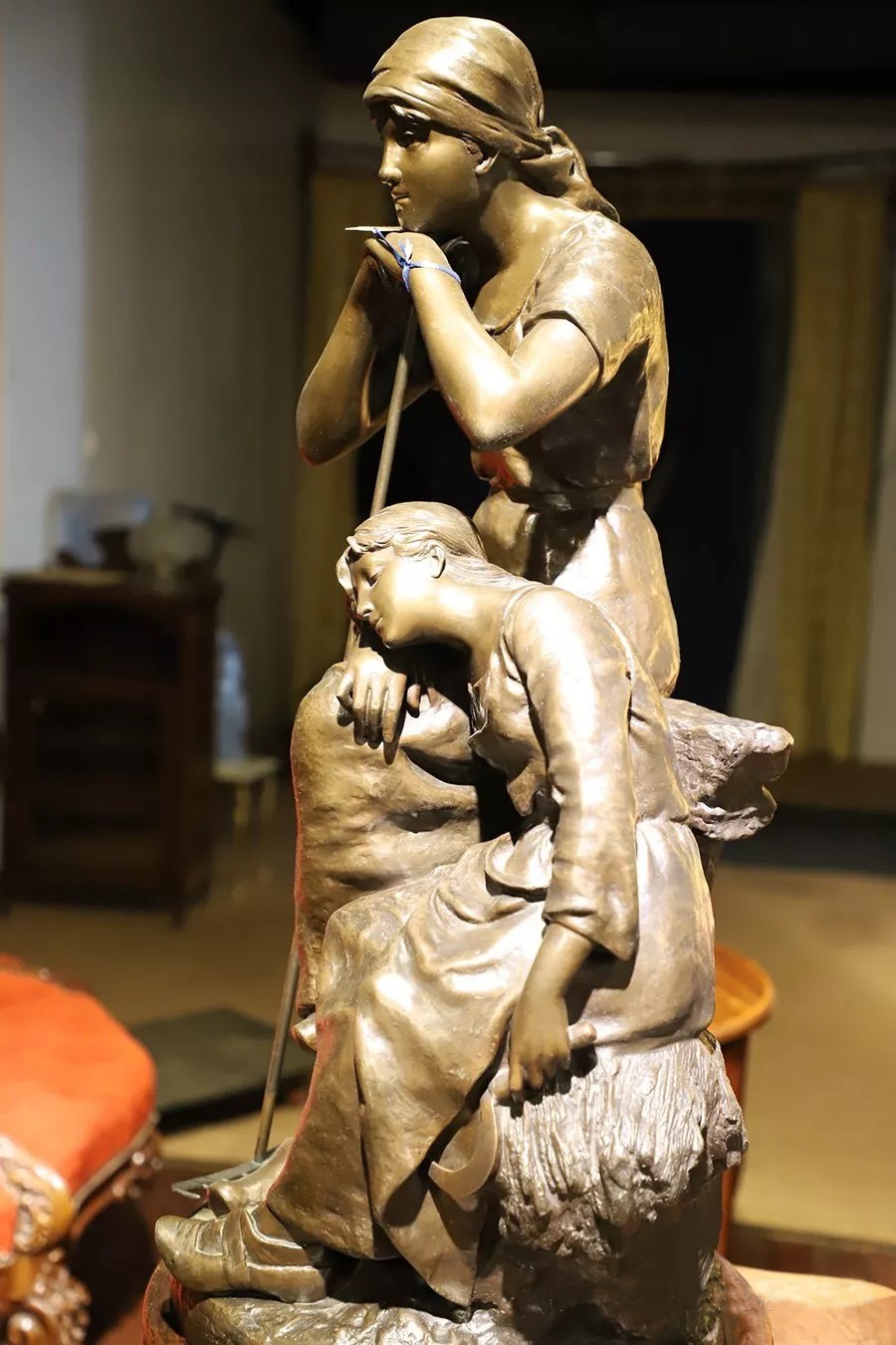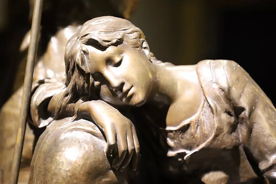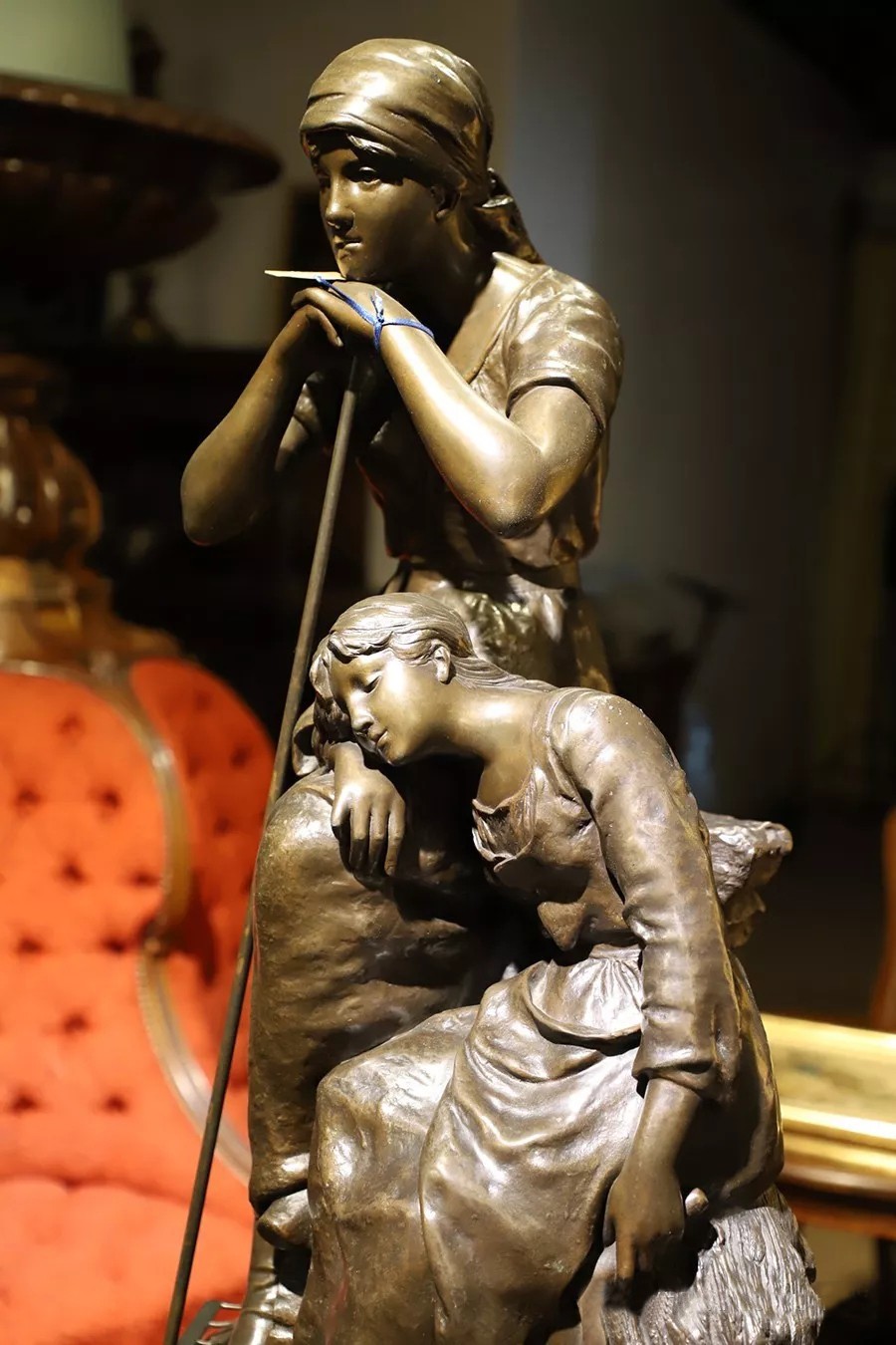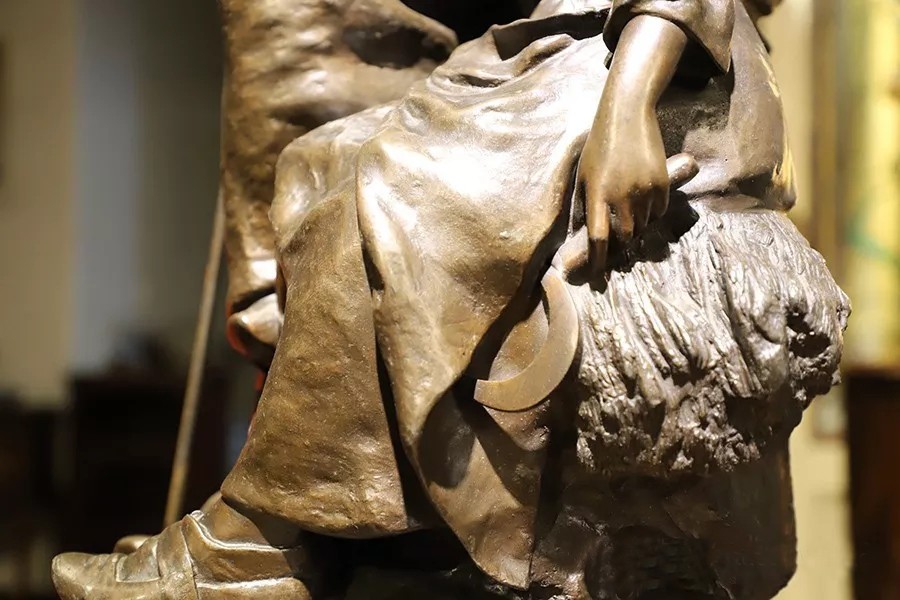 帶有作者簽名的鑄銅雕塑——《勞作歇息的少女》,描述了兩個正在休息的勞動少女形象,其中一個下巴擱在撐著耙子的雙手上,一個手持鐮刀側躺在撐著耙子的少女腿上睡著了,人物形象栩栩如生。尺寸為:高860×寬460×厚460(帶圓形底座)。
